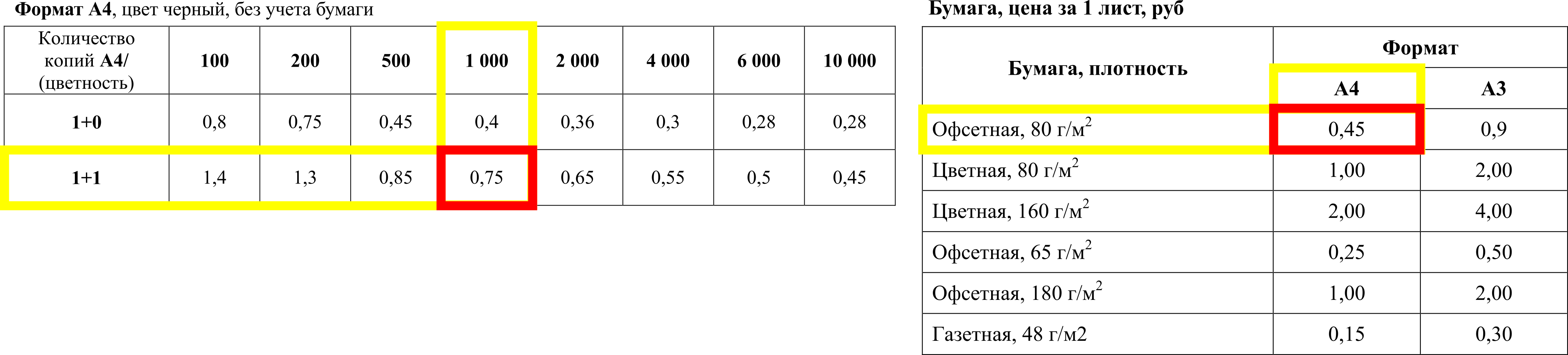 Находим в таблице «Формат А4» столбик ,с количеством «1000» листов и строку «1+1», к цифре их пересечения прибавляем стоимость офсетной бумаги плотностью 80 г/м2 формата А4 из таблицы «Бумага». Умножаем полученную цифру на количество листов Вашего тиража.